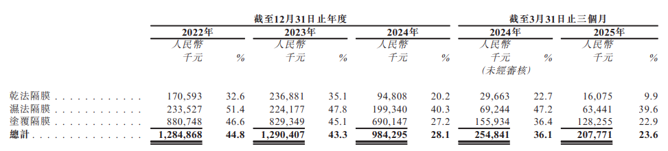 从最新数据来看,星源材质涂覆隔膜的出货占比有所下降,在2025年第一季度销售营收5.59亿元占总额的63.4%,而干法隔膜和湿法隔膜销售额占比分别为18.4%和18.2%。而从毛利率来看,湿法隔膜毛利率最高,在2025年一季度仍然高达39.6%。