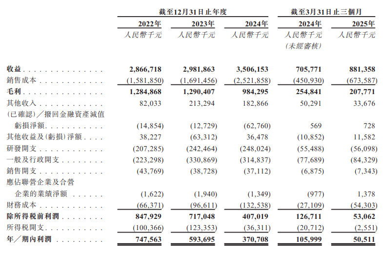招股书显示,星源材质在2022年至2024年营收分别为28.67亿元、39.82亿元35.06亿元,其中2025年第一季度营收8.81亿元,较去年同期同比增长24.88%。而毛利润来看,2022年至2024年分别为12.85亿元、12.90亿元和9.84亿元,其中2025年第一季度毛利润2.08亿元,较去年同期下降18.5%。