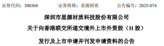 7月7日晚,电池隔膜龙头星源材质公告,已于2025年7月7日向港交所递交公开发行境外上市外资股申请,并同日刊登相关资料。